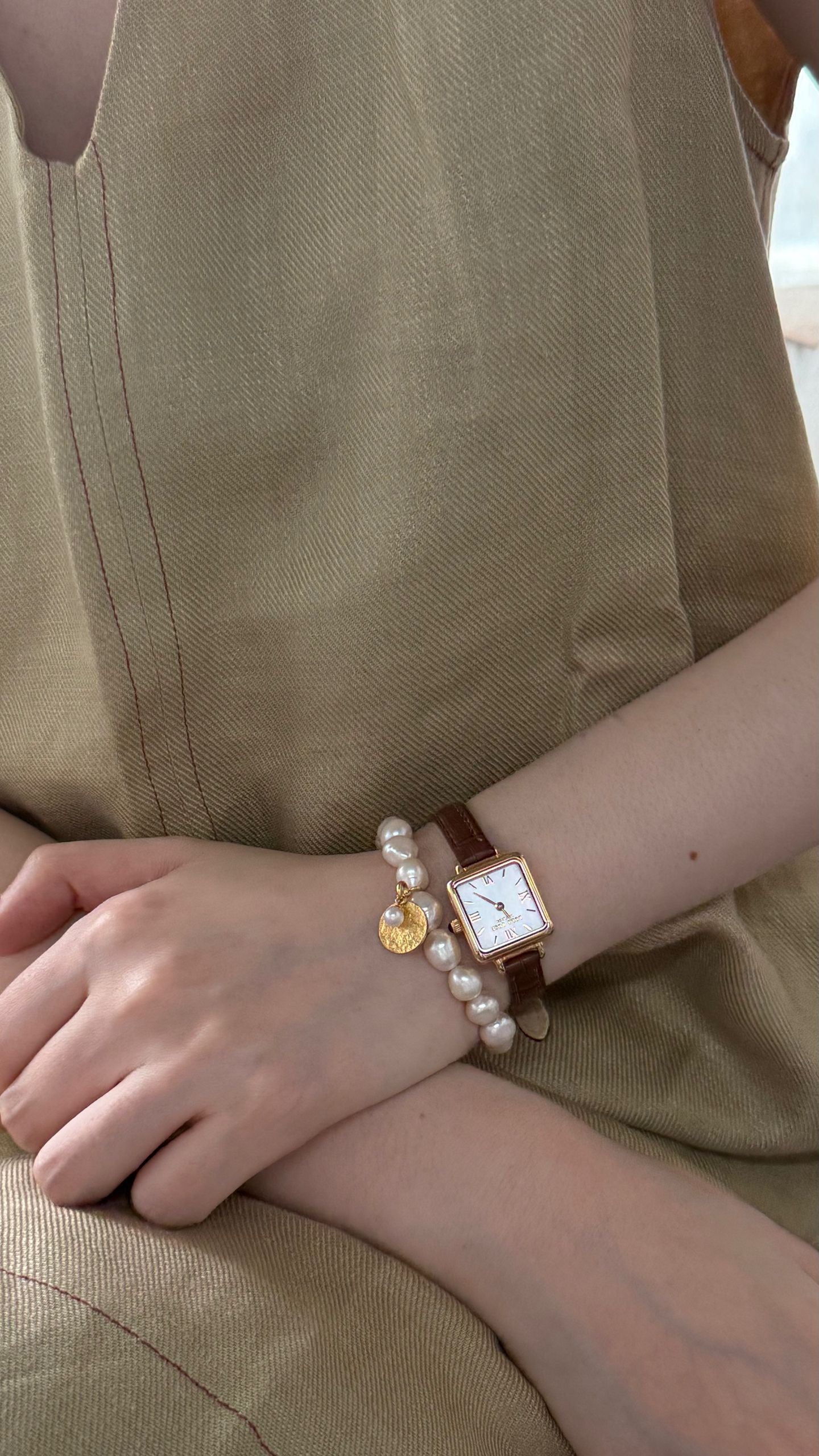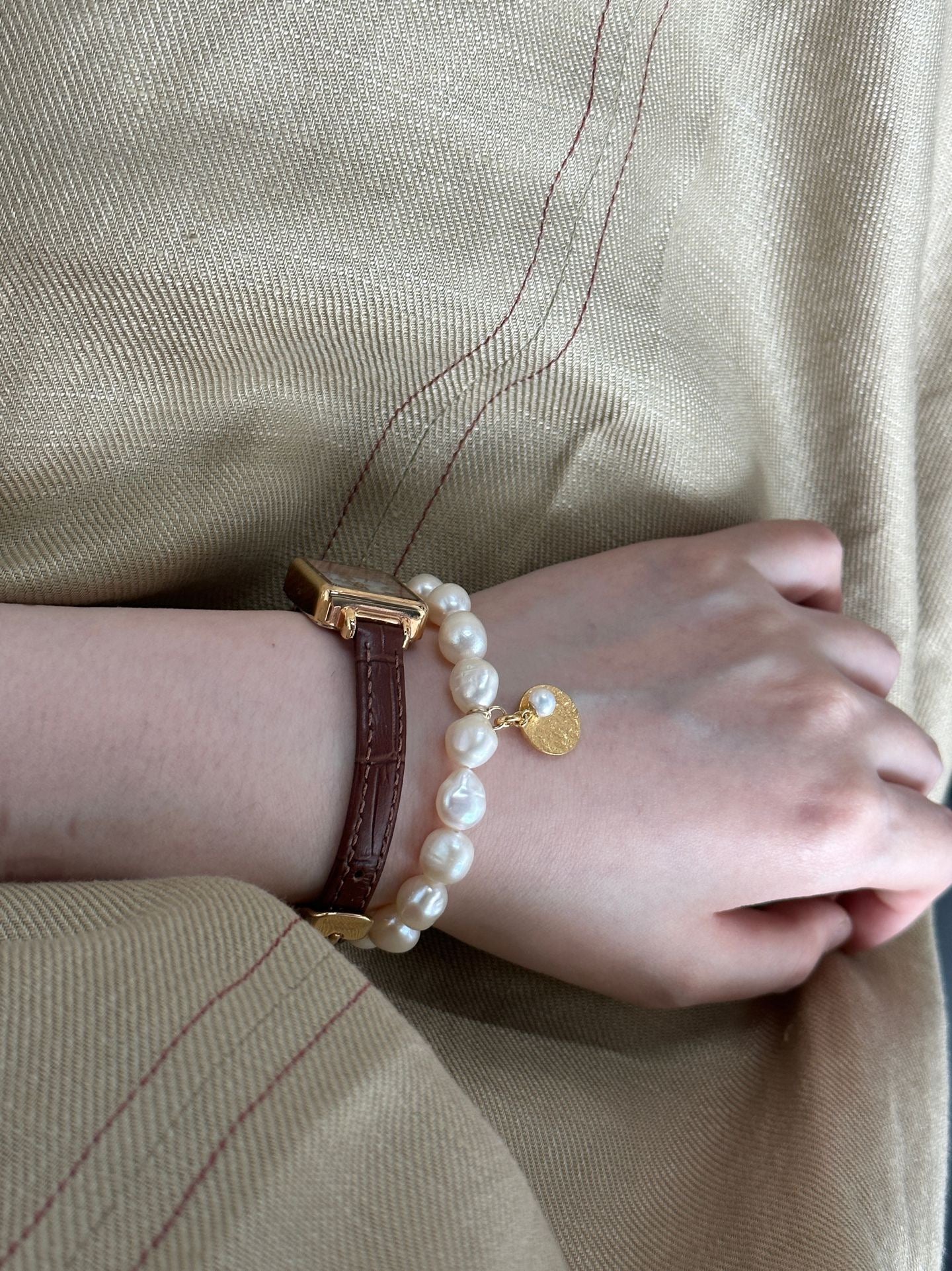 The mix of natural pearl texture with vintage gold coin detailing creates a sophisticated and artistic aesthetic โ low-key yet unmistakably refined.