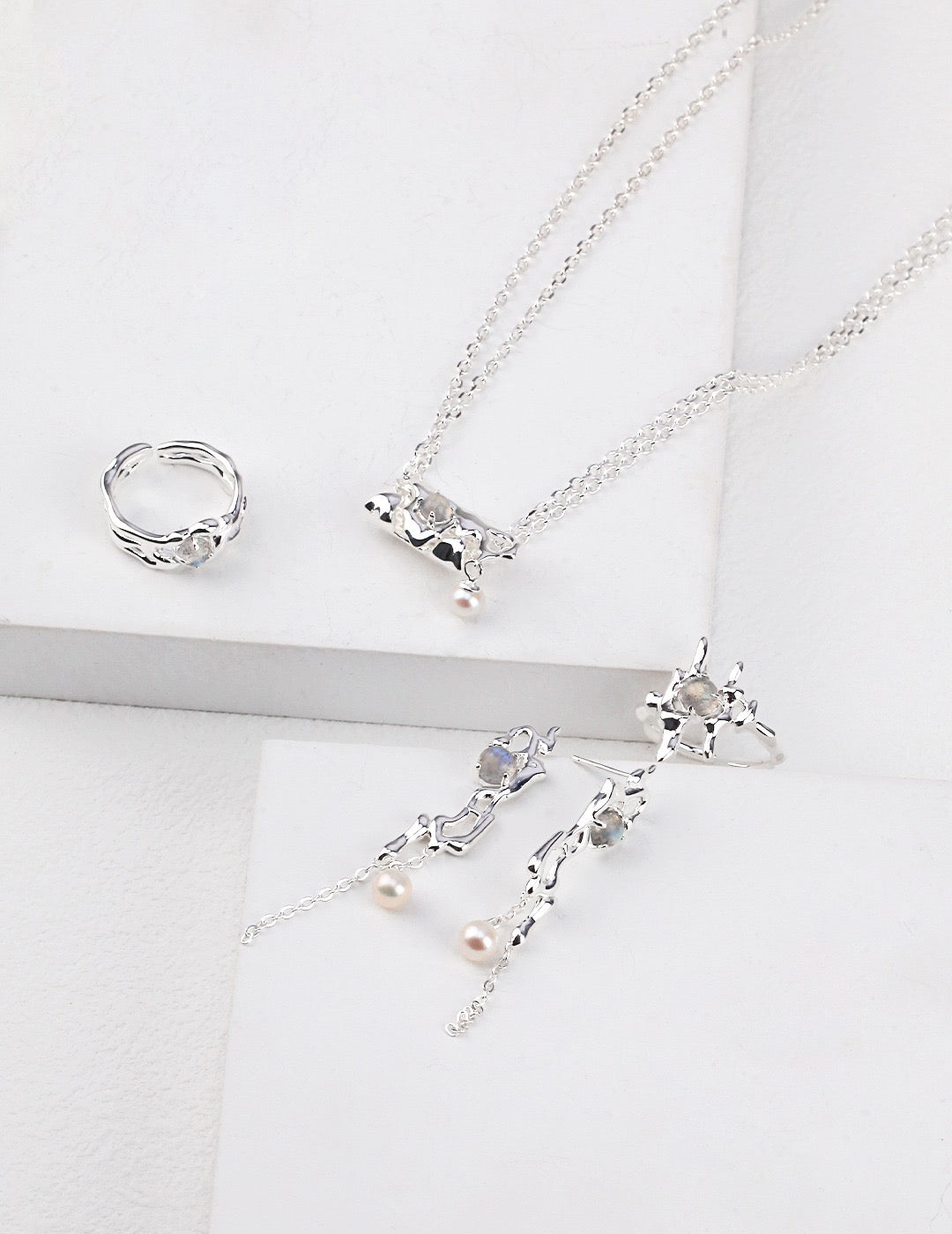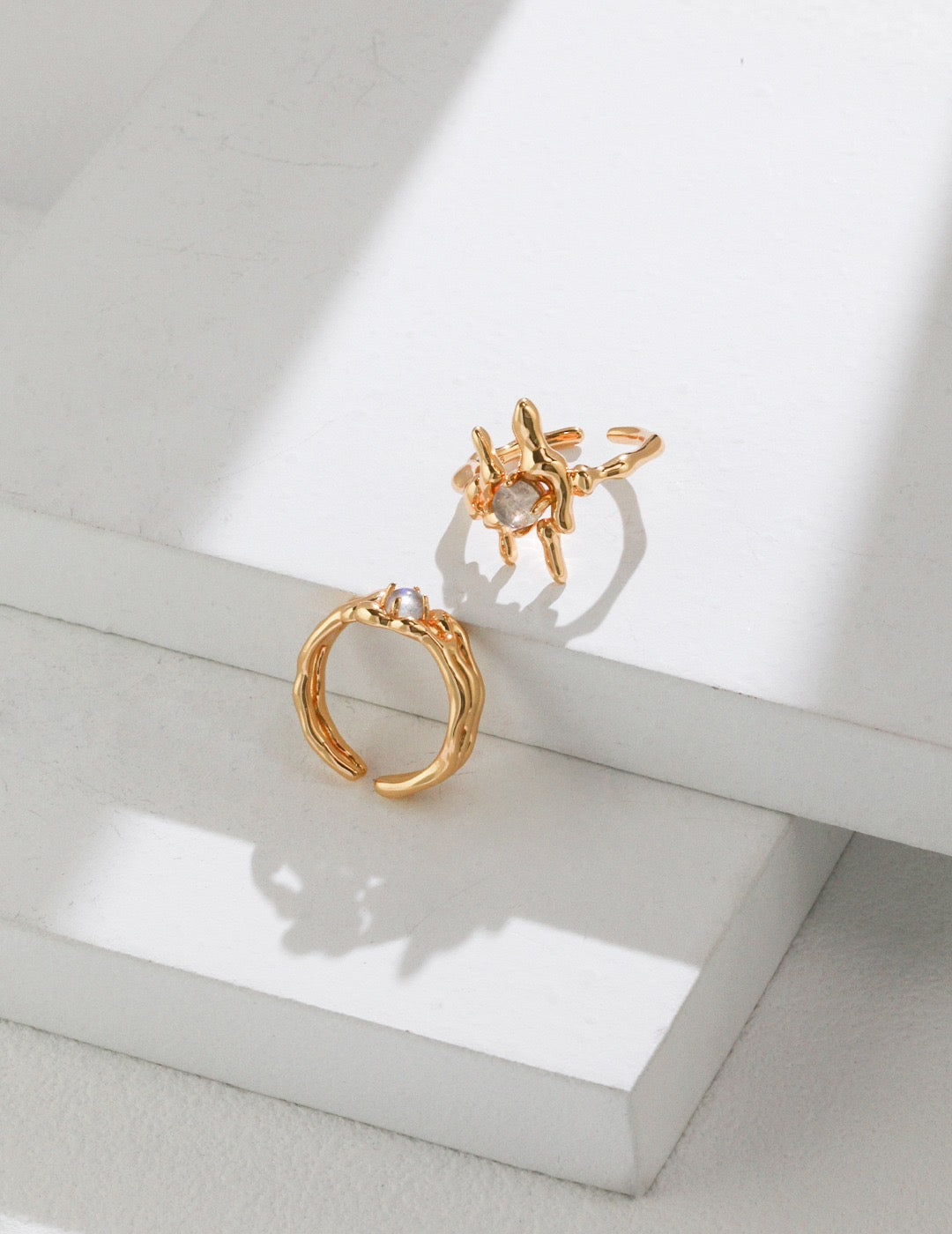 Crafted with an organic, flowing surface and a beautifully embedded gray moonstone, this S925 Silver Friendship Ring symbolizes harmony, connection, and emotional balance. The fluid, rippled texture evokes natural movement—like water over stone—while the subtle shimmer of moonstone adds a soft, magical touch.